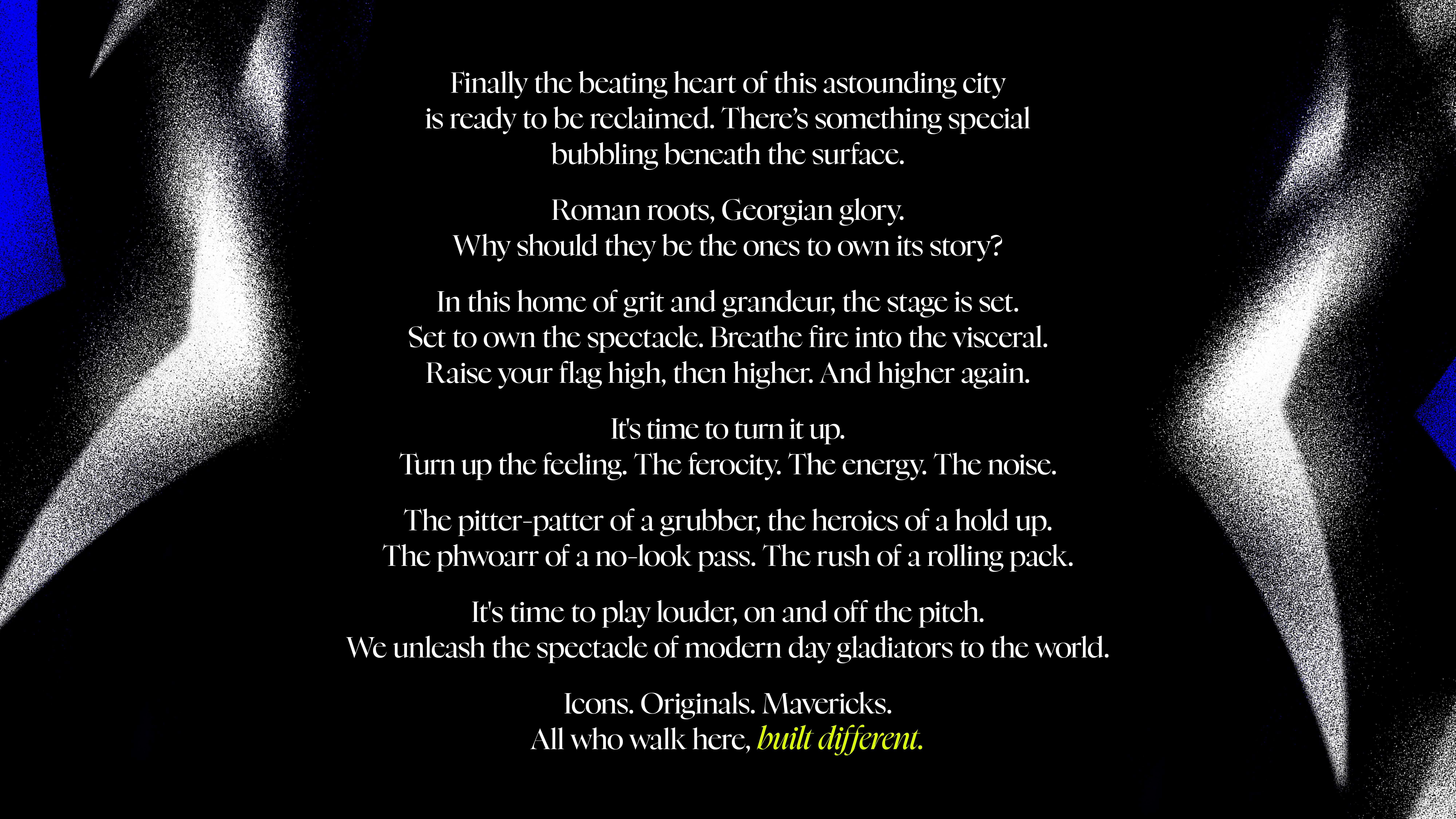 Rugby had lost its spectacle. Sport fans today crave emotion, drama and goosebumps. The same energy they find in entertainment, fashion and gaming. This club needed to stand for more than tradition and gentlemanly warfare. The city’s Roman heritage and Georgian reputation for showmanship offered an ownable truth: Bath is where grit meets grandeur. This became an oozing metaphor for everything rugby should be, an intense heart-pounding display of ferocity, guts and artistry.